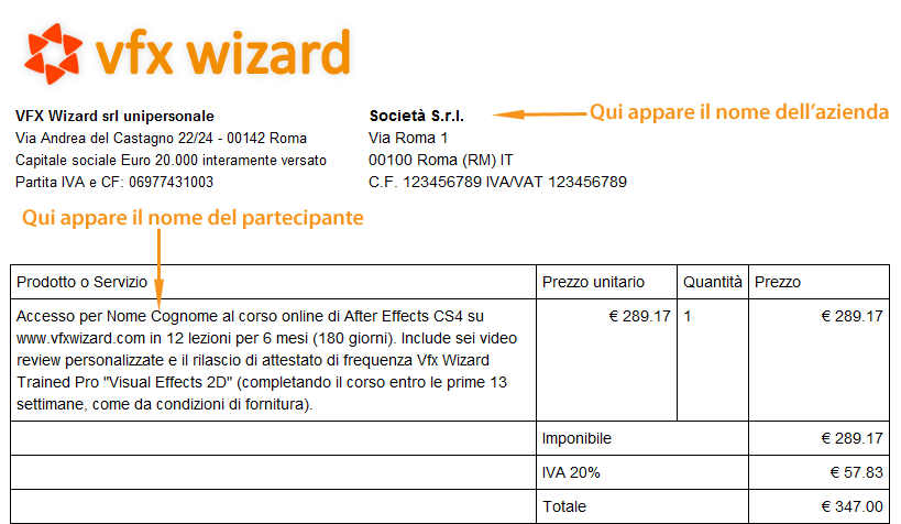 La fattura viene emessa nel momento in cui il pagamento viene effettivamente ricevuto e registrato dal personale dell'azienda VFX Wizard srl. Questo è il momento in cui, durante l'orario di ufficio, verifichiamo che un bonifico viene accreditato sul nostro conto o PayPal ha trasferito i fondi dalla carta di credito.