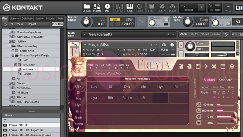 Nell'immagine vediamo appunto la versione commerciale di Kontakt con uno strumento virtuale caricato direttamente, perché le librerie Strezov non appaiono nella tab Libraries