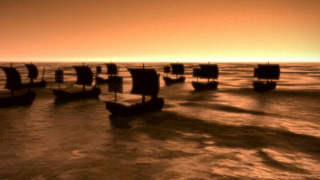 The opening image, with a bunch of junks sailing at sunset, is a 3D scene so simple that it's embarrassing. Literally takes less than a minute to setup.